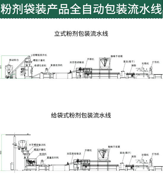 先来看一套粉剂的袋装包装生产线方案,主机分为给袋式粉剂亚新(中国)和立式自制袋亚新(中国)