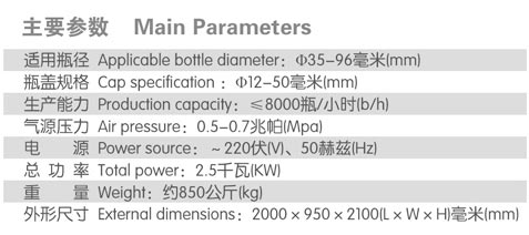 适用不同规格圆瓶、方瓶的外盖自动旋合,具有结构紧凑、操作简单,调整规格方便快捷的特点。