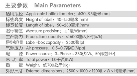 适用于圆形玻璃瓶、塑料瓶、聚酯瓶的连续纸标签粘贴。贴标性能稳定、换标操作简单。