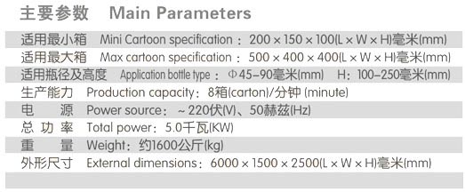 核心配备5:KZF型全自动开箱、装箱、封箱机组,配套瓶装生产线的后道全自动装箱生产。同时拥有多项国家技术专li,整机性能可靠,产能高,包装效果美观。